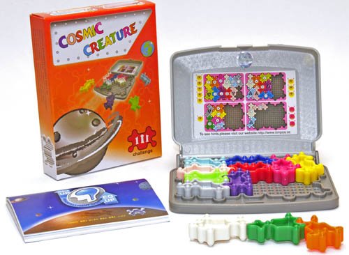 Cosmic Creature Brain Teaser consists of 12 blob-shaped (very uniquely shaped) puzzle pieces. There are over 106 different challenges to complete. In each case one is presented with 2 or more pieces which are set in the tray for a given challenge. Attempt to fit in the remaining pieces without moving the given pieces.