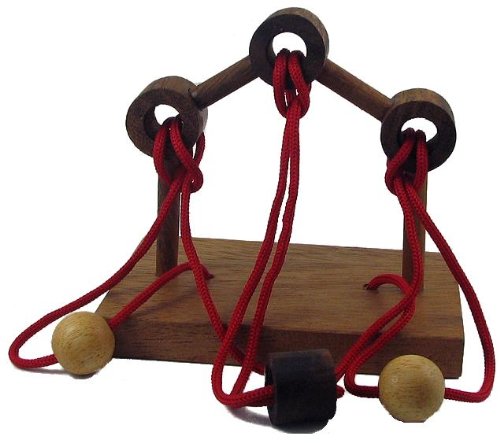 This is a difficult and very puzzling wooden brain teaser string puzzle. The wooden beads are too large to go through the wooden hole, yet the goal is to bring all three together onto the same loop of cord. Read more...