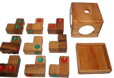 There are 6 puzzles to try and solve from the 9 L shaped pieces! An EXCELLENT puzzle with many challenges. Level 1 (easy) - make a cube, any cube Level 3 (moderate) - make a cube with just red dots showing on all 6 outer surfaces. Then, make a cube with just green dots Level 3+ (moderate +) - make a cube that looks just like a Dice cube (numbers 1 - 6 with opposite sides adding up to 7) Level 4+ (tough) - make a Dice cube with just RED dots. Then make a Dice cube with just GREEN dots. Read more...