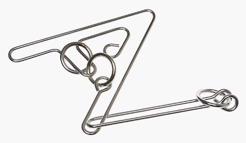 This faculty-flustering chrome contraption may leave you sitting in a corner drooling and mumbling to yourself. The puzzle is shaped like the letter A with a couple of rings attached; a 6-inch finger of steel--called a handle--slides freely around the perimeter. Your object is to free the handle: not an easy task even if you're following the directions, which are in mirror print on the back of the package. If you're one who is naturally good at this sort of thing, the puzzle probably ranks about a 7 on a difficulty scale of 1 to 10. Since many of us regularly find ourselves comparing that type of intelligence with the likes of Einstein and Sagan, the boost to your ego might make it worth the effort even if it takes you awhile to solve the puzzle. Good luck! --Julie Ubben