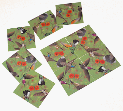 You don't need a feeder outside your window to enjoy these tiny lightning-fast birds. Four types of hummingbirds adorn this version of the Scramble Squares challenge. Easy to Play, but Hard to Solve is the motto for this deceptively simple-looking puzzle. By the time you've become addicted and find yourself unable to solve the thing, you'll realize it's not so much a motto as a warning. Nine colorfully illustrated cardboard 4-by-4-inch squares depict various unfinished images of hummingbirds and flowers along their edges. The images must be matched and the nine squares arranged in a larger square. An ingenious, elegantly executed puzzle idea, Scramble Squares will have you simultaneously blessing and cursing its inventor. --Claire Dederer
