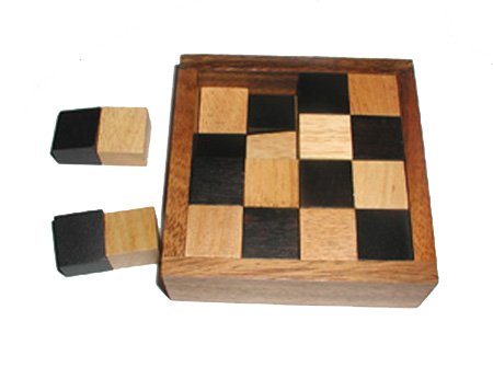 16 wooden puzzle pieces, consisting of a white and a dark wood block, cut at various angles. Each piece represents one of the possible ways that two pieces of 2 colors cut at different angels can be joined. The objective is to assemble the pieces into a two-layer, 5x5 checkerboard pattern with the colors matching on both layers and with all of the pieces fitting flush to the top of the puzzles wooden container. It is a difficult level 5 puzzle. This is a high quality version of the puzzle measuring 4 3/4" square by 1.5" deep. Fit and finish is one of the best we have to offer. Read more...